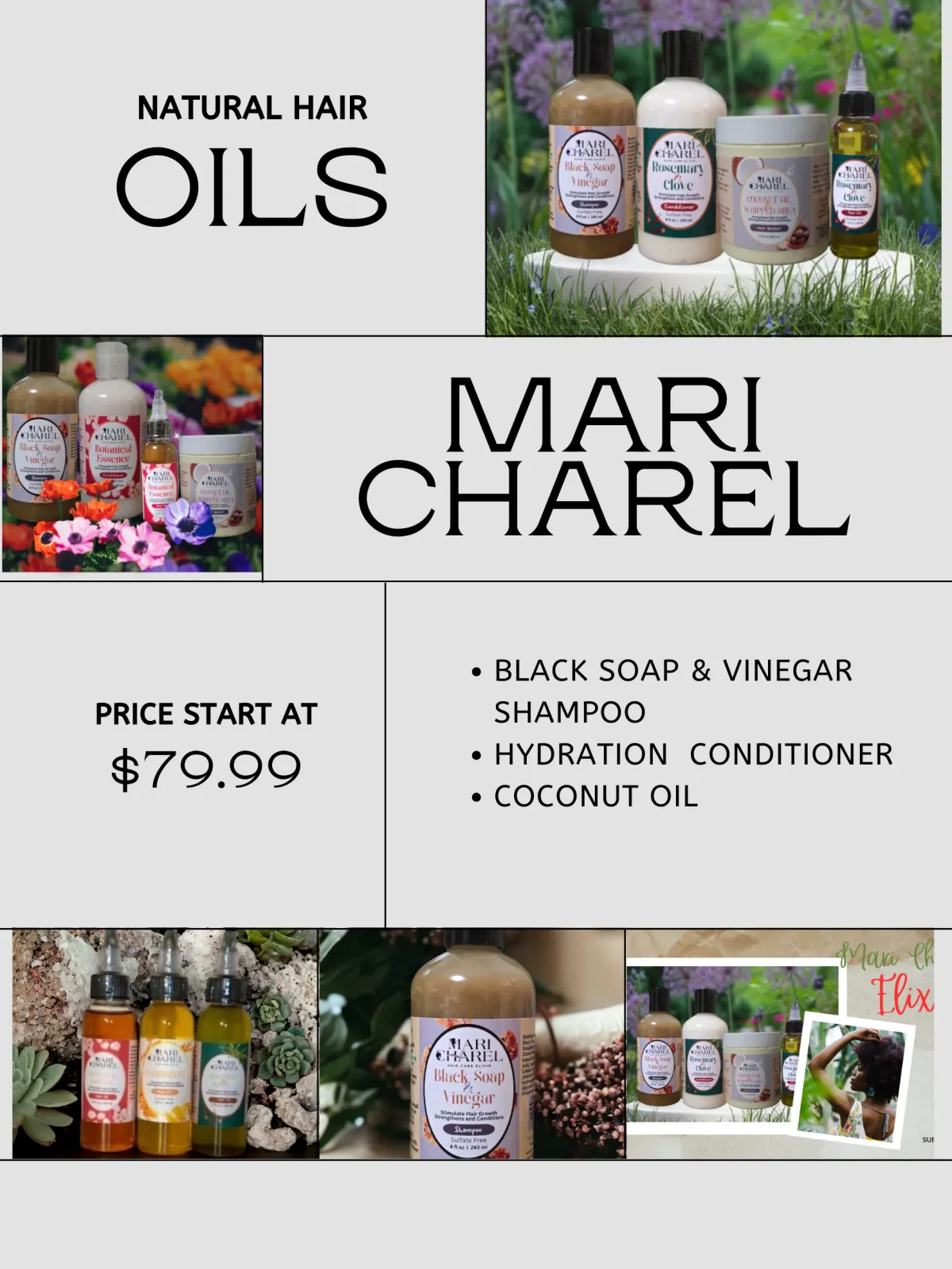 Welcome to Mari Charel Hair Care Elixir. My passion for hair care emerged from my personal hair journey. After experiencing severe hair damage, I sought solutions tailored to natural hair. Frustrated by the lack of effective products, I created a line that embraces natural hair beauty and delivers transformative results with the finest natural ingredients. At Mari Charel, I understand the struggles and am committed to offering hair care products that nourish, repair, and celebrate the unique beauty of every strand. Your hair deserves the best natural oils for growth and strength.